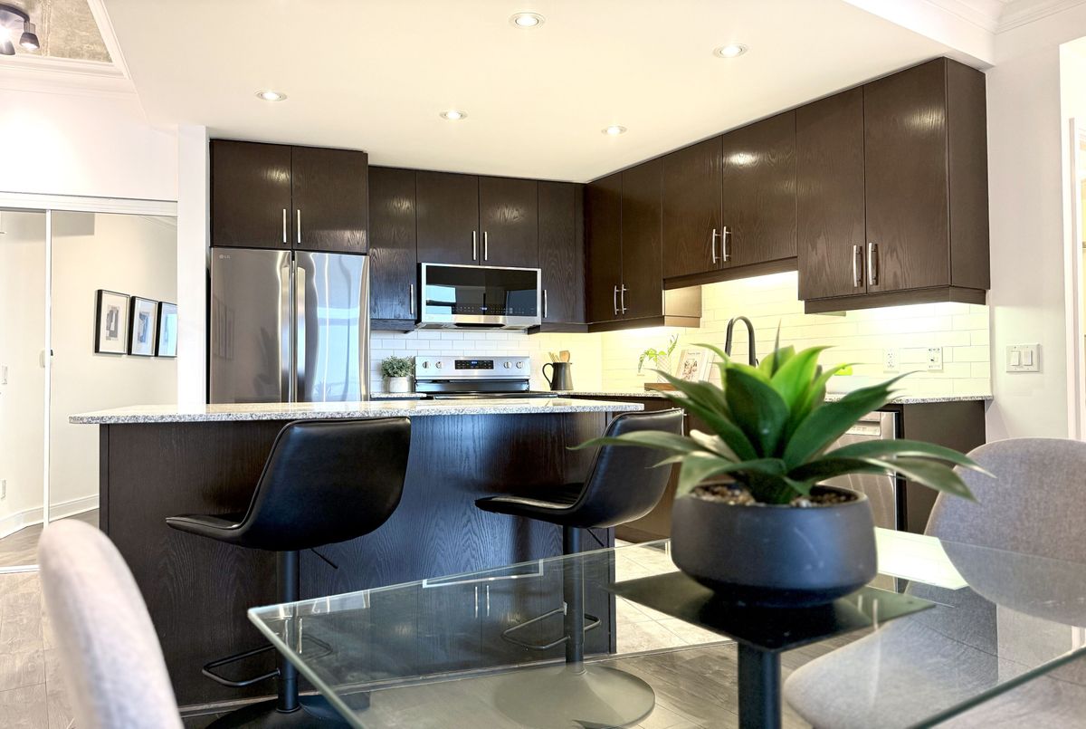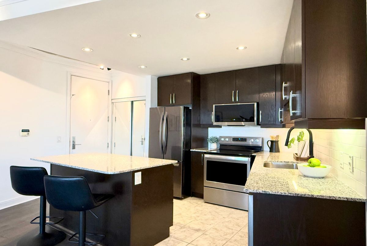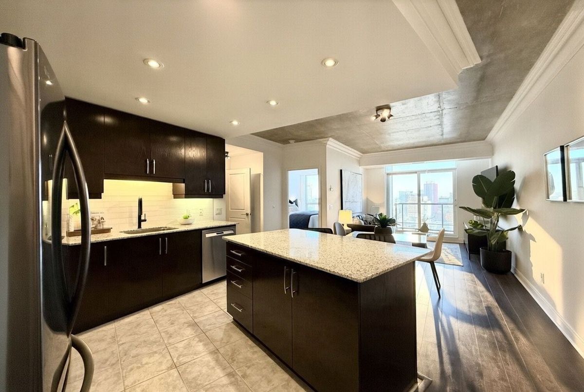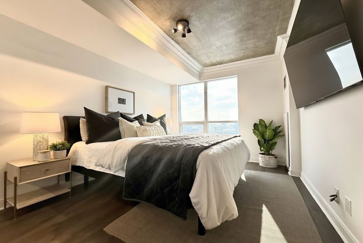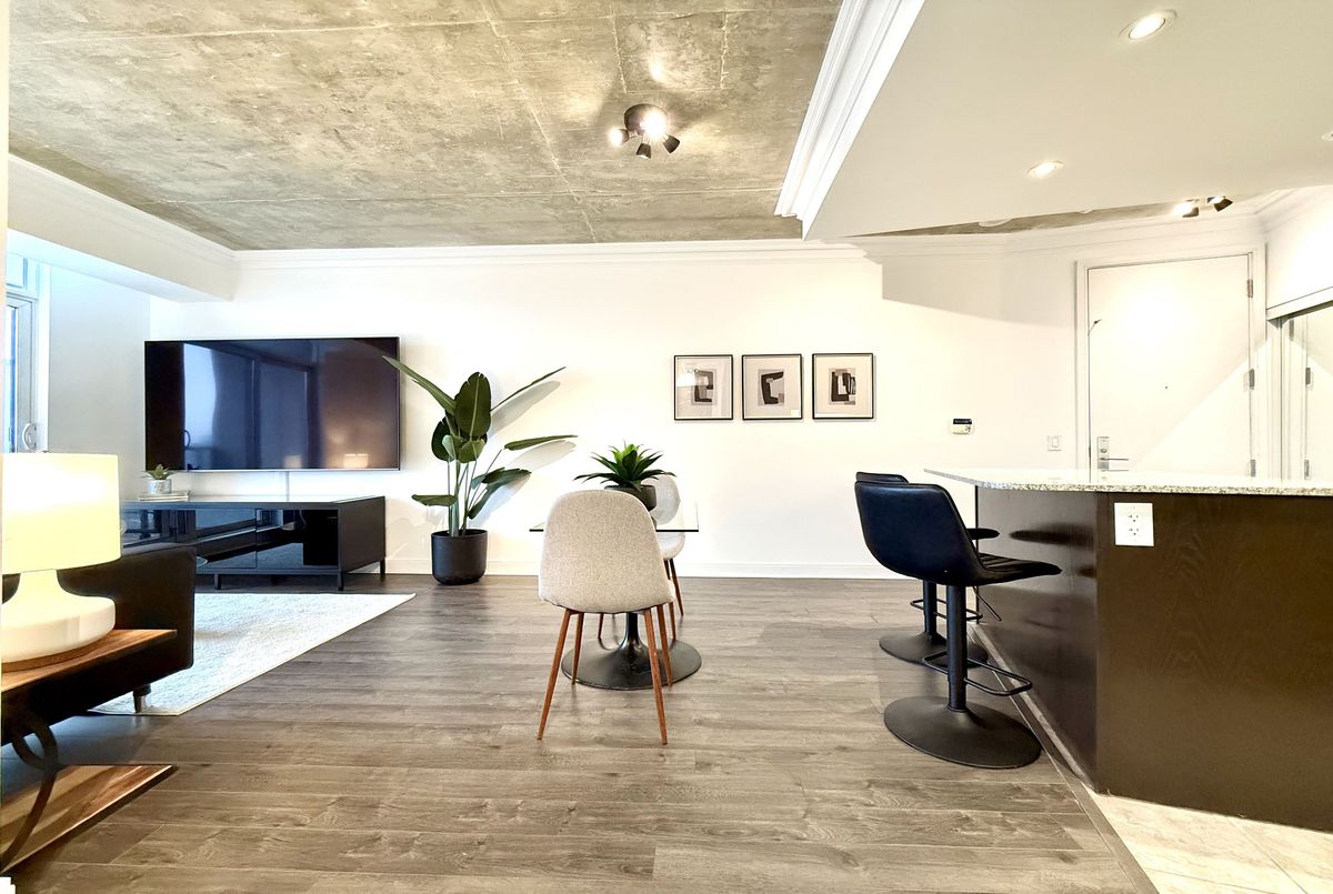 Live on The Esplanade in this bright, high floor, corner 1 bedroom suite offering 615 sq ft of well designed space with beautiful east views of the city and lake. Featuring 9 ft smooth exposed concrete ceilings that add height and character, giving the space a subtle loft inspired feel, along with dark espresso hardwood flooring throughout the living and dining areas. The functional kitchen is equipped with stainless steel appliances, granite countertops, an undermount sink, and a center island that doubles as a breakfast bar. The spacious bedroom is filled with natural light and offers a large closet with California Closet organizers. Marble bathroom, in suite laundry, and thoughtful storage including a custom coat California Closet organizer add to the comfort of the space. All appliances were recently purchased in 2025. This suite is being offered fully furnished with two large LG TVs (75" & 85"), couch, motorized king bed, and an entertainment unit included. Just bring your pillow and sheets. Option to assume a premium rental parking spot located directly by the garage door and close to the elevators for $200 per month, prepaid until June, giving you time to decide if you need it. Located in the iconic London on the Esplanade, tucked between Front Street and the waterfront, steps to the Financial District, St. Lawrence Market, Union Station, The PATH, Sugar Beach, Metro, LCBO, restaurants, shopping, and transit. Walk Score 100. Building amenities include 24 hour concierge, rooftop outdoor pool, full fitness center and spa, party room, theatre room, library, and guest suites.
