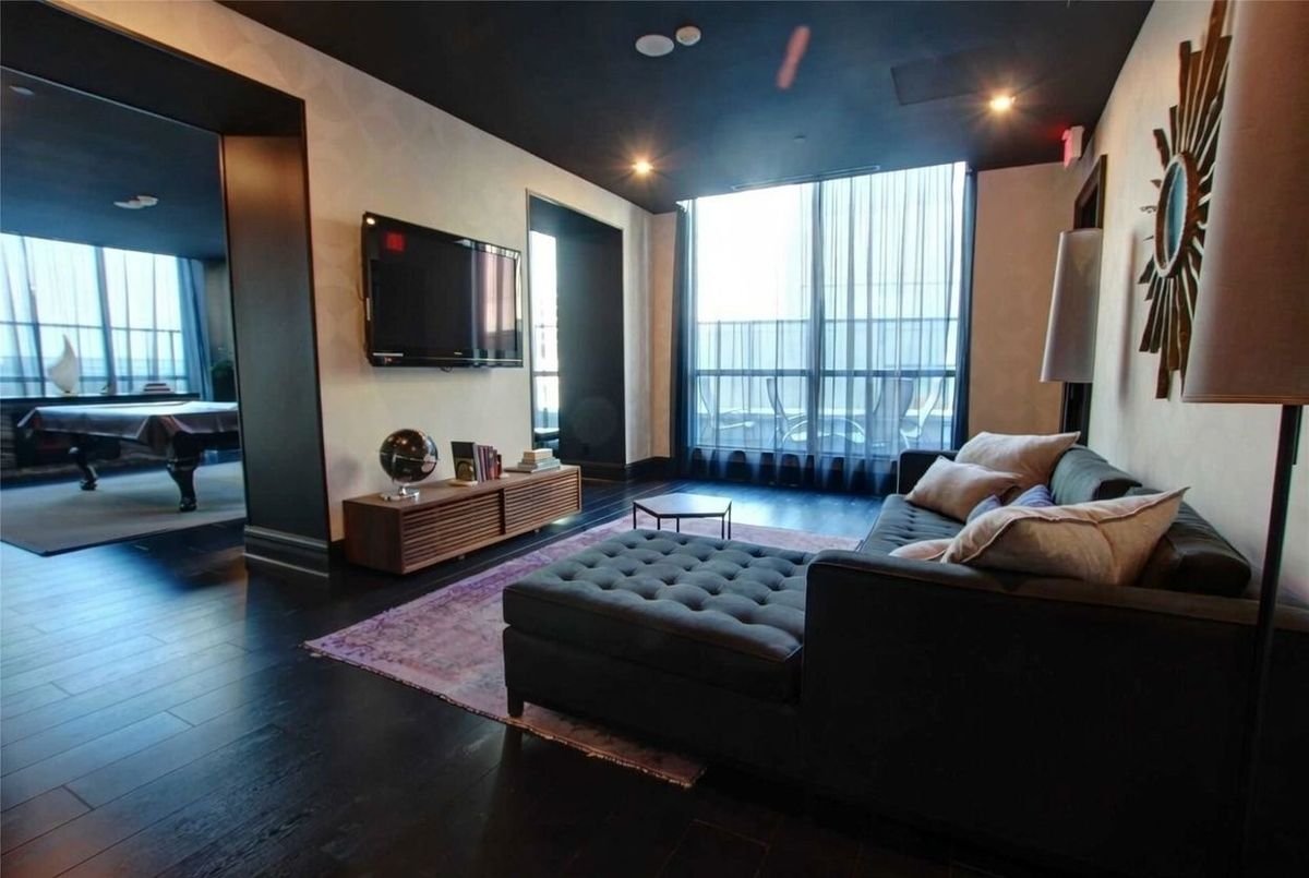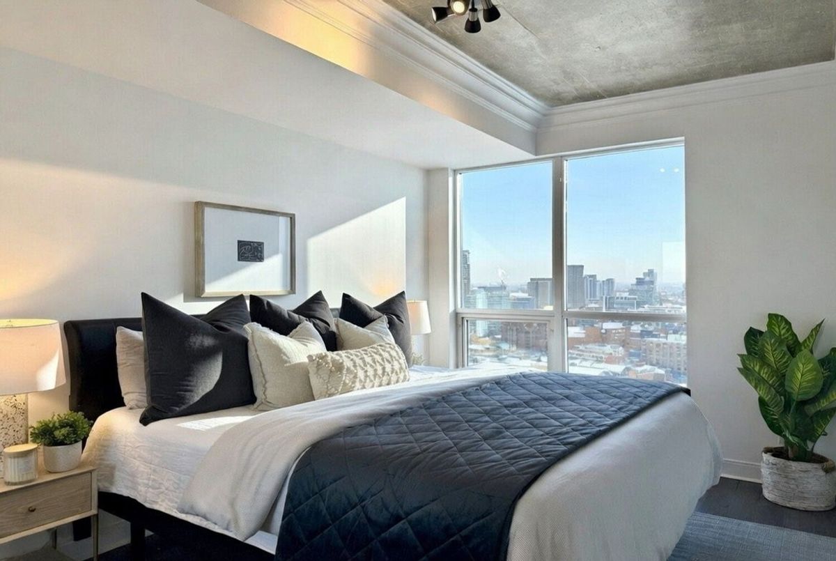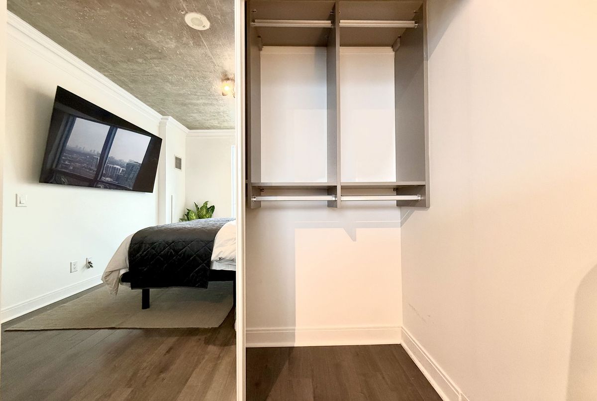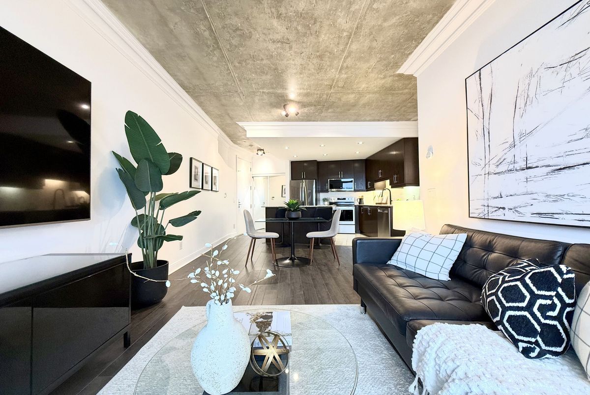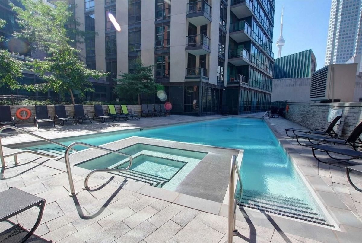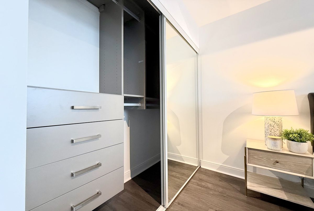 Live on The Esplanade in this bright, high floor, corner 1 bedroom suite offering 615 sq ft of well designed space with beautiful east views of the city and lake. Featuring 9 ft smooth exposed concrete ceilings that add height and character, giving the space a subtle loft inspired feel, along with dark espresso hardwood flooring throughout the living and dining areas. The functional kitchen is equipped with stainless steel appliances, granite countertops, an undermount sink, and a center island that doubles as a breakfast bar. The spacious bedroom is filled with natural light and offers a large closet with California Closet organizers. Marble bathroom, in suite laundry, and thoughtful storage including a custom coat California Closet organizer add to the comfort of the space. All appliances were recently purchased in 2025. This suite is being offered fully furnished with two large LG TVs (75" & 85"), couch, motorized king bed, and an entertainment unit included. Just bring your pillow and sheets. Option to assume a premium rental parking spot located directly by the garage door and close to the elevators for $200 per month, prepaid until June, giving you time to decide if you need it. Located in the iconic London on the Esplanade, tucked between Front Street and the waterfront, steps to the Financial District, St. Lawrence Market, Union Station, The PATH, Sugar Beach, Metro, LCBO, restaurants, shopping, and transit. Walk Score 100. Building amenities include 24 hour concierge, rooftop outdoor pool, full fitness center and spa, party room, theatre room, library, and guest suites.