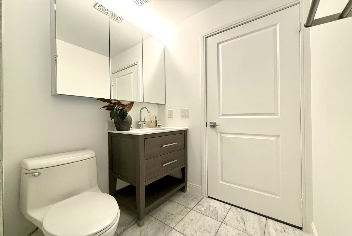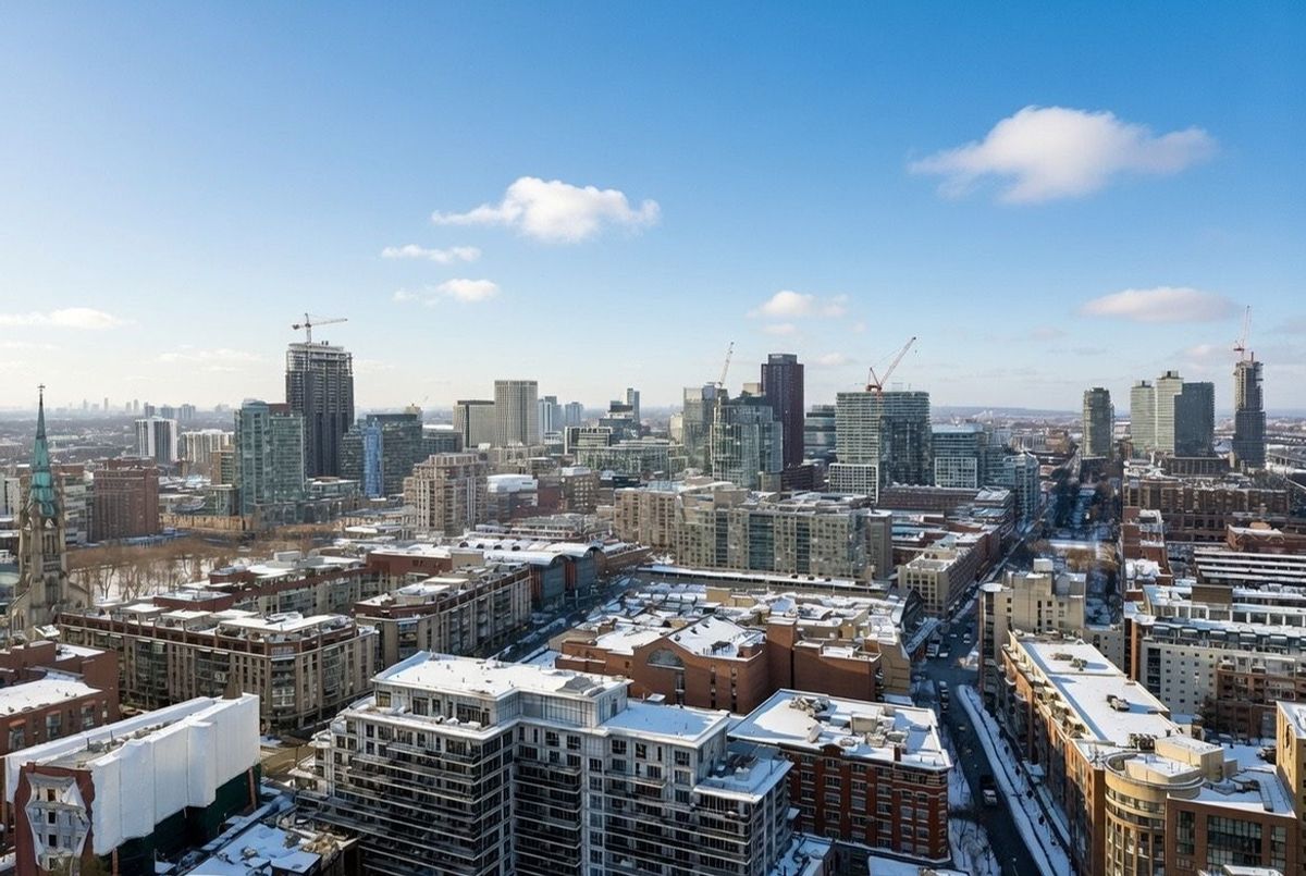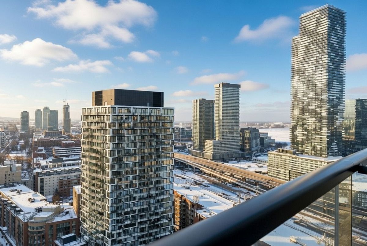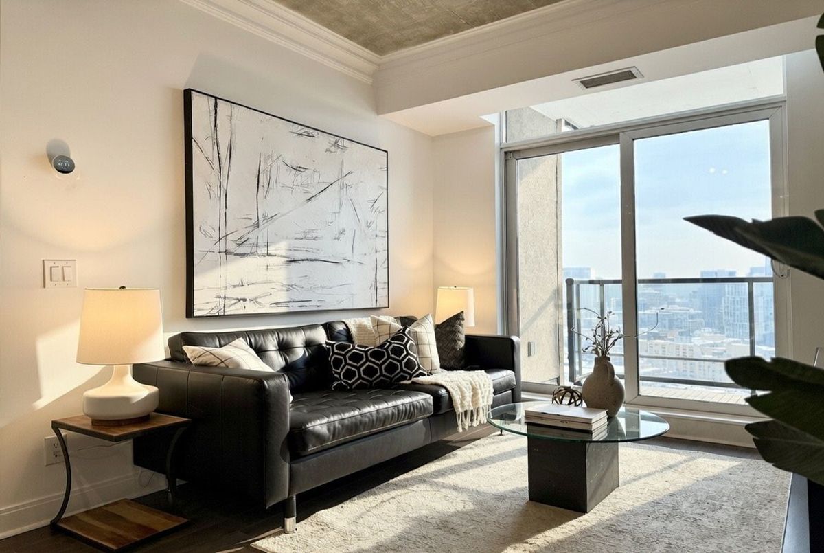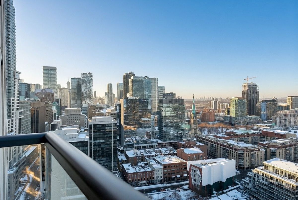 Live on The Esplanade in this bright, high floor, corner 1 bedroom suite offering 615 sq ft of well designed space with beautiful east views of the city and lake. Featuring 9 ft smooth exposed concrete ceilings that add height and character, giving the space a subtle loft inspired feel, along with dark espresso hardwood flooring throughout the living and dining areas. The functional kitchen is equipped with stainless steel appliances, granite countertops, an undermount sink, and a center island that doubles as a breakfast bar. The spacious bedroom is filled with natural light and offers a large closet with California Closet organizers. Marble bathroom, in suite laundry, and thoughtful storage including a custom coat California Closet organizer add to the comfort of the space. All appliances were recently purchased in 2025. This suite is being offered fully furnished with two large LG TVs (75" & 85"), couch, motorized king bed, and an entertainment unit included. Just bring your pillow and sheets. Option to assume a premium rental parking spot located directly by the garage door and close to the elevators for $200 per month, prepaid until June, giving you time to decide if you need it. Located in the iconic London on the Esplanade, tucked between Front Street and the waterfront, steps to the Financial District, St. Lawrence Market, Union Station, The PATH, Sugar Beach, Metro, LCBO, restaurants, shopping, and transit. Walk Score 100. Building amenities include 24 hour concierge, rooftop outdoor pool, full fitness center and spa, party room, theatre room, library, and guest suites.